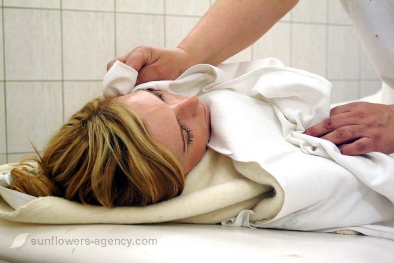 Die Dauer der teilweisen oder ganzheitlichen Packung ist 20 Minuten. Die Prozedur wird mit der Dusche und mit der trockenen Packung in Dauer bis 15 Minuten beendet.