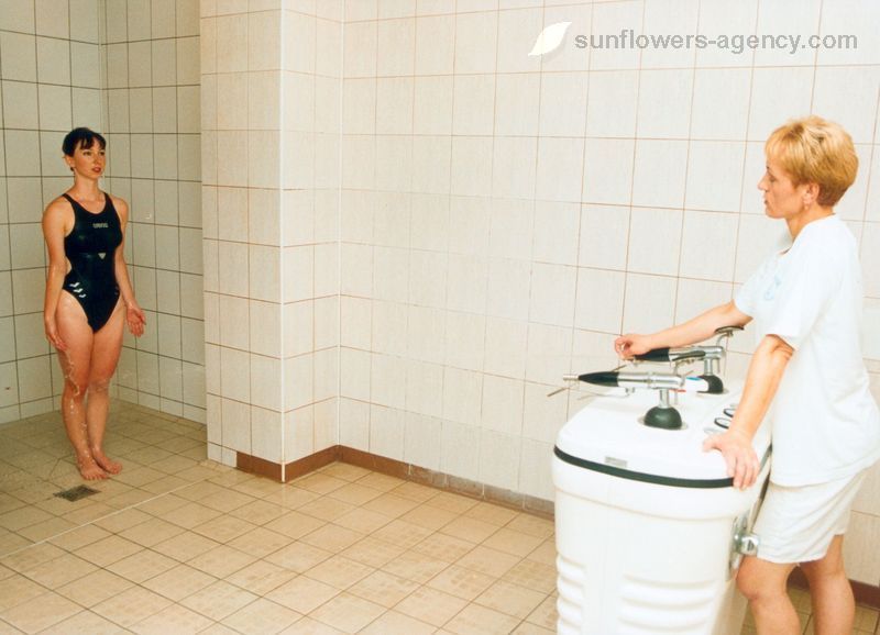 Sie erfolgt durch Wasserstrahl aus einer Düse, unter Druck von 3at, aus einer Entfernung von 4m. Angefangen wird mit 38° - 42°C warmem Strahl 30 Sekunden lang, danach folgt kalter Strahl von 16° - 18°C, 5 – 10 Sekunden lang.