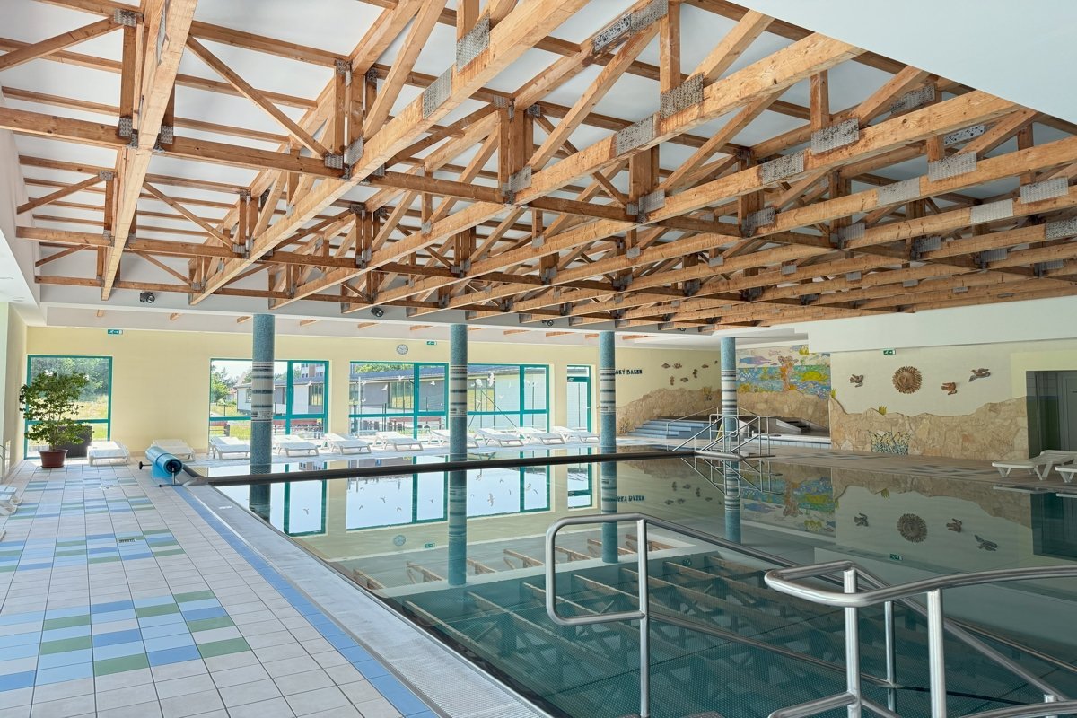 Schwimmbad im Kurhaus in Bardejovské Kúpele bietet ideale Möglichkeiten zur Entspannung und Therapie. Mit den Abmessungen von 12 x 10 Metern und einer Wassertemperatur zwischen 28 - 30 °C. Ein großer Vorteil ist, dass das Becken rollstuhlgerecht ist und somit zu den inklusiven Einrichtungen zählt und ganzjährig geöffnet ist. Der Pool steht Gästen benachbarter Hotels zur Verfügung, wie beispielsweise Villa Diana, Hotel Ozón, Hotel Astória, Hotel Alžbeta, Hotel Alexander, Villa Lujza,