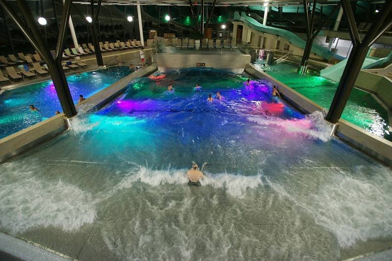 750 m² Fläche bieten eine Vielzahl von Attraktionen, wie beispielsweise ein Wellenbad, das Spaß für jedermann garantiert. Zur Entspannung dient das Tepidarium, und Saunaliebhabern stehen unterschiedliche Saunen zur Verfügung: Eukalyptussauna, Aromasauna, Salzgrotte, Biosauna, Infrarotsauna, Dampfbad und traditionelle finnische Sauna. Für die jüngsten Gäste gibt es ein Kinderbecken, während Erwachsene