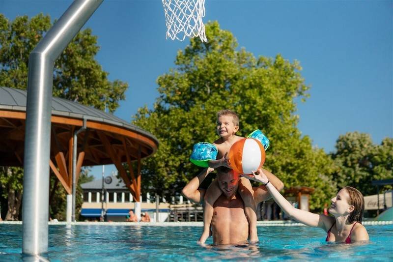 warme Wasser, Thermalwasser, 23 - 36 °C, Luftdüsen, Wasserspeier, Eingang für behinderte Personen, Gegenstrom, Toboggan, Bar, Erholungsraum, Wasserpilz, selbstständiges Wirbelbad, ganzjährig geöffnet